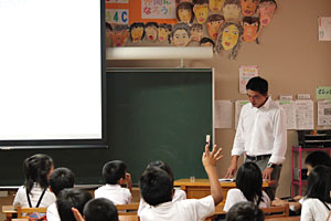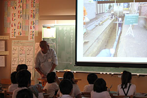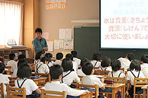 パワーポイントを使って約45分、私たちの普段のお仕事の紹介、世界の水道事情などを説明します。途中で、生徒さんに質問をすると、みんな元気よく、積極的に手をあげてくださいました。