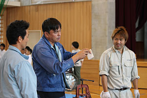 水道工事、家庭の水道の仕組みを、実際に水が流れる仕組みを屋外に設置して、体験して貰います。今回は、あいにくの雨のため、屋外で行う事ができませんでしたが、蕪城小学校さまのご協力で、体育館で行いました。