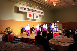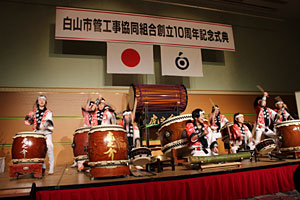 式典に続く祝賀会では、松任民謡協会さま、輪島・和太鼓 虎之介さまに会を盛り上げて頂きました。また来賓の方々や当会員間の交流はもちろん、当会員の社員さん、ご家族もいらっしゃっていたので、日頃中々交流できないメンバーで、食事を交えながらゆっくり楽しく過ごして頂けたと思います。