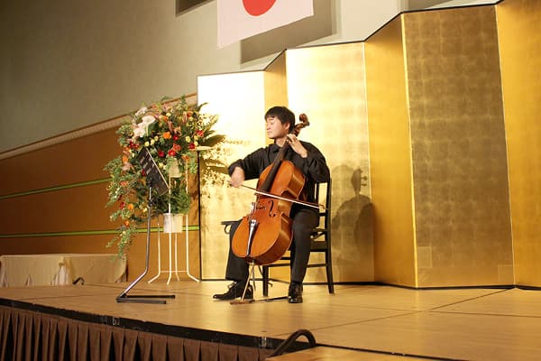 式典に続く祝賀会では、白山市出身のチェロ奏者 池田虎之介さんの演奏でスタートし、会場全体がチェロの音色に引き込まれている様子がとても印象的でした。つづく祝賀会では、来賓の方々、当組合員、ご家族の方が食事を交えながら、楽しく過ごして頂けたと思います。皆さま有難うございました。